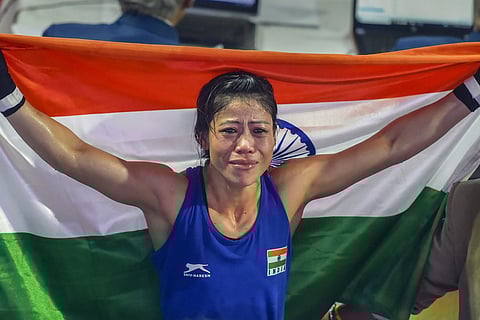 Mary Kom gets emotional as she celebrates after winning the final match of women's light flyweight (45-48 kg) against Ukraine's Hanna Okhota at AIBA Women's World Boxing Championships in New Delhi on November 24, 2018. She became the first woman boxer to win six World titles. PTI Photo/Ravi Choudhary