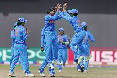 Dayalan Hemalatha celebrates with her teammates after taking a wicket during a Group B match against New Zealand of the 2018 ICC Women's World T20 at Providence on November 9, 2018. PTI Photo