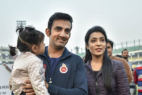 Gautam Gambhir poses for photos with wife Natasha Jain and daughter, on the last day of Ranji Trophy match between Delhi and Andhra at Feroz Shah Kotla Ground in New Delhi on December 9, 2018.