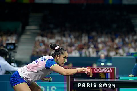 India's Manika Batra plays a shot against France's Prithika Pavade in the women's singles round of 32 match at the Summer Olympics, in Paris.