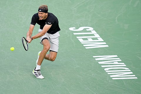 Alexander Zverev, of Germany, returns to Carlos Alcaraz, of Spain, during a quarterfinal match at the BNP Paribas Open tennis tournament in Indian Wells, California.