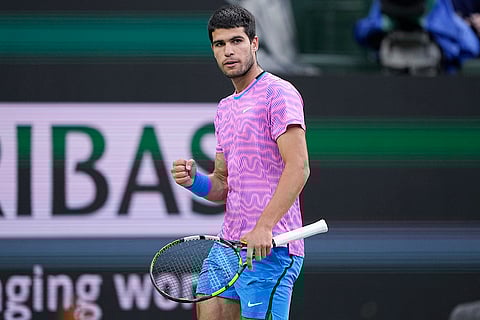 Carlos Alcaraz, of Spain, reacts after winning a point against Alexander Zverev, of Germany, during a quarterfinal match at the BNP Paribas Open tennis tournament in Indian Wells, California.