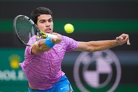 Carlos Alcaraz, of Spain, returns to Alexander Zverev, of Germany, during a quarterfinal match at the BNP Paribas Open tennis tournament in Indian Wells, California.