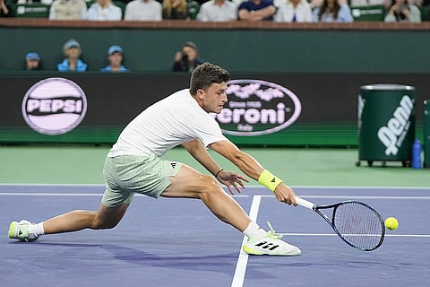Luca Nardi, of Italy, returns a shot Novak Djokovic, of Serbia, at the BNP Paribas Open tennis tournament in Indian Wells, California.