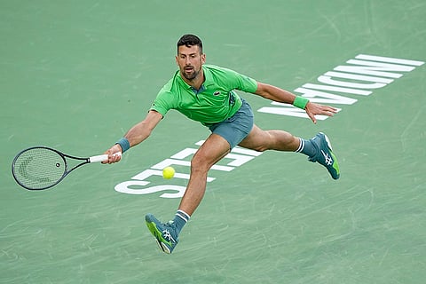 Novak Djokovic, of Serbia, returns a shot Luca Nardi, of Italy, at the BNP Paribas Open tennis tournament in Indian Wells, California.