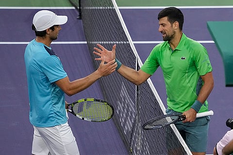 Novak Djokovic, of Serbia, right, shakes hands with Aleksandar Vukic, of Australia, after defeating him at the BNP Paribas Open tennis tournament in Indian Wells, California.