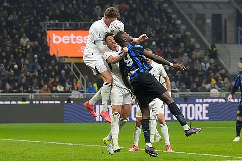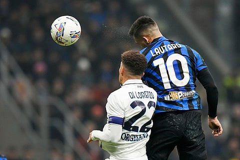 Inter Milan's Lautaro Martinez, right, attempts a header on goal challenged by Napoli's Giovanni Di Lorenzo during a Serie A soccer match between Inter Milan and Napoli at the San Siro stadium in Milan, Italy.