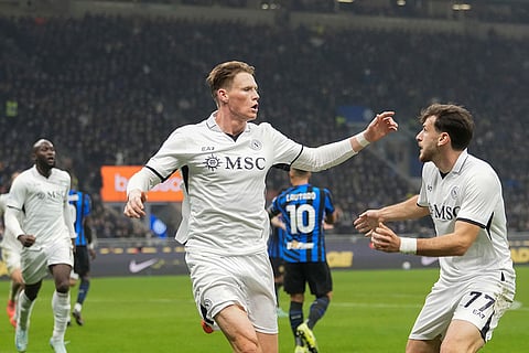 Napoli's Scott McTominay, center, celebrates scoring his side's opening goal during a Serie A soccer match between Inter Milan and Napoli at the San Siro stadium in Milan, Italy.