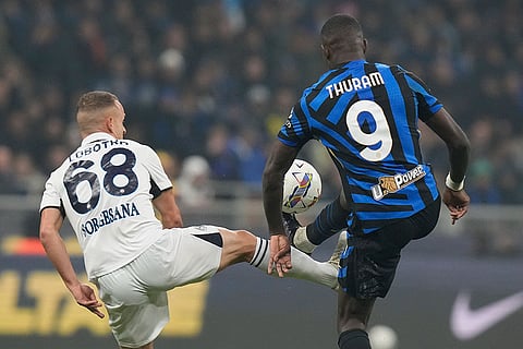 Napoli's Stanislav Lobotka, left, and Inter Milan's Marcus Thuram compete for the ball during a Serie A soccer match between Inter Milan and Napoli at the San Siro stadium in Milan, Italy.