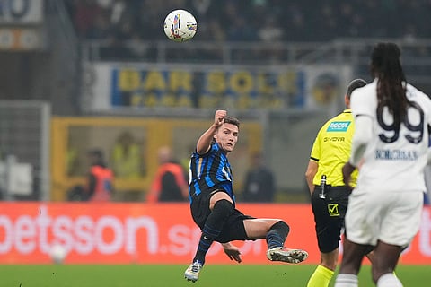 Inter Milan's Hakan Calhanoglu tries control the ball during a Serie A soccer match between Inter Milan and Napoli at the San Siro stadium in Milan, Italy.