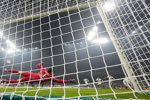 Inter Milan's Hakan Calhanoglu misses a penalty kick as Napoli's goalkeeper Alex Meret dives for the ball during a Serie A soccer match between Inter Milan and Napoli at the San Siro stadium in Milan, Italy.