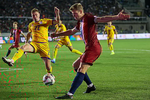 Norway's Felix Myhre, right, controls the ball while Kazakhstan's Marat Bystrov, left, tries to stop him during the UEFA Nations League soccer match between Kazakhstan and Norway at Ortalyk Stadium in Almaty, Kazakhstan.