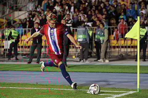 Norway's Martin Odegaard makes a corner kick during the UEFA Nations League soccer match between Kazakhstan and Norway at Ortalyk Stadium in Almaty, Kazakhstan