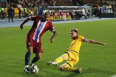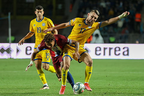 Kazakhstan's Alexandr Marochkin, left, fights for the ball with Norway's Alexander Sorloth during the UEFA Nations League soccer match between Kazakhstan and Norway at Ortalyk Stadium in Almaty, Kazakhstan.