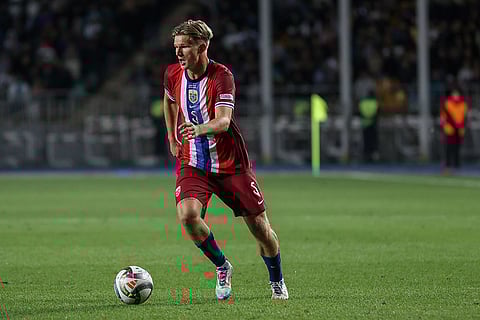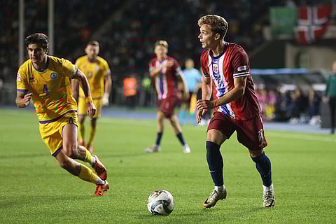 Norway's David Moller Wolfe runs with the ball the ball during the UEFA Nations League soccer match between Kazakhstan and Norway at Ortalyk Stadium in Almaty, Kazakhstan.
