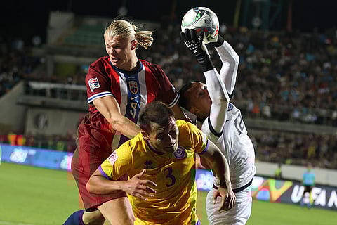 Kazakhstan's goalkeeper Igor Shatskiy, right, and Nuraly Alip, center, fight for the ball with Norway's Erling Haaland during the UEFA Nations League soccer match between Kazakhstan and Norway at Ortalyk Stadium in Almaty, Kazakhstan.