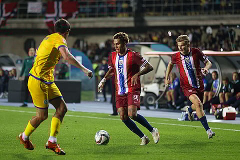 Norway's Antonio Nusa, center, controls the ball alongside teammate David Moller Wolfe, right while Kazakhstan's Marat Bystrov, left, tries to stop them during the UEFA Nations League soccer match between Kazakhstan and Norway at Ortalyk Stadium in Almaty, Kazakhstan.