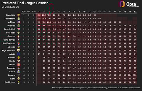 Barca beat Real Madrid to the title by four points last term and they are the Opta supercomputer's favourites to retain their crown in 2025-26, doing so in 47% of season simulations with Madrid doing so in 31.8%.