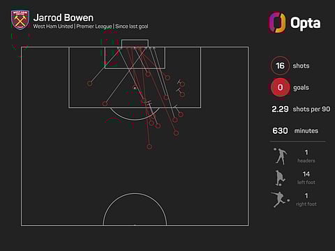 However, Bowen has not hit the back of the net since the end of September, scoring against Everton, and has gone seven games without a goal, despite having 16 shots worth 0.9 (xG) since that game.