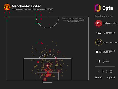 That is United's only shutout in 2025-26 so far, though, and they have conceded 20 goals in 13 matches from 18.8 expected goals against (xGA).