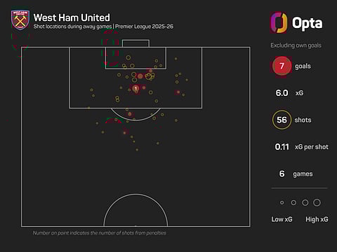 Their total shots (56) are also down on their travels (71 at home), with just 20 of those testing the opposition goalkeeper. Only four West Ham players have had more than one shot on target, with Callum Wilson responsible for seven.