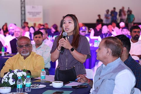 Olympic medalist weightlifter Mirabai Chanu speaks at the event