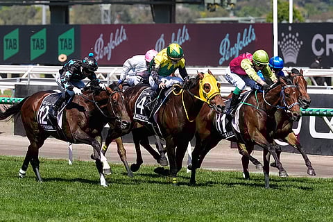 Knight's Choice, second right, ridden by Robbie Dolan, races to the finish line to win the Melbourne Cup horse race ahead of Warp Speed, center, ridden by Akira Sugawara, at Flemington Racecourse in Melbourne, Australia.