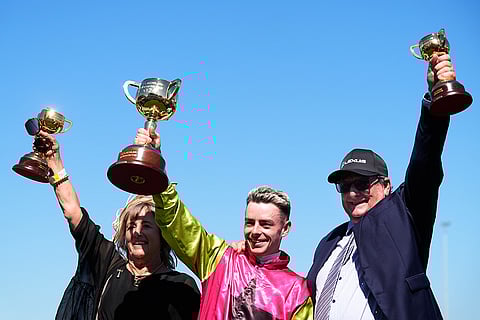 Jockey Robbie Dolan, center, along with trainers John Symons, right, and Sheila Laxon hold their trophies after winning the Melbourne Cup horse race with Knight's Choice at Flemington Racecourse in Melbourne, Australia.