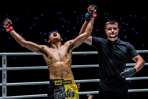 After dropping a close split decision in their electric first encounter at ONE Friday Fights 107 in May, the 16-year-old came out swinging and scored the first knockdown with a low kick followed by a three-punch combo.