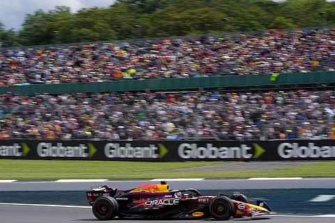 Red Bull driver Max Verstappen of the Netherlands steers his car during the qualifying session at the Silverstone racetrack, Silverstone, England.