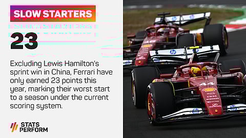 If the 12 points earned through Hamilton's sprint victory are disregarded, their 23 points collected makes this their worst start after three races of a season since the current scoring system was introduced in 2010, falling short of the previous low mark of 26 points scored in 2023.