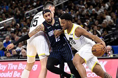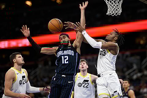 Orlando Magic guard Trevelin Queen (12) and Utah Jazz guard Isaiah Collier (13) battle for a rebound as center Walker Kessler (24) and forward Kyle Filipowski (22) look on during the second half of an NBA basketball game in Orlando, Florida.
