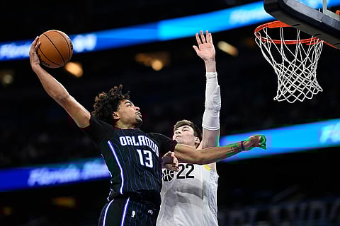 Orlando Magic guard Jett Howard (13) goes up to dunk as Utah Jazz forward Kyle Filipowski (22) defends during the second half of an NBA basketball game in Orlando, Florida.