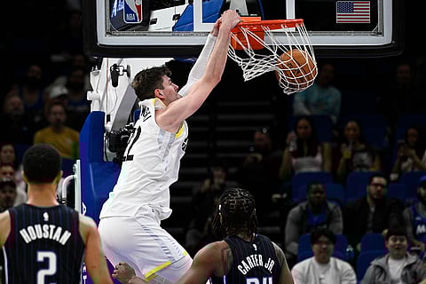 Utah Jazz forward Kyle Filipowski (22) dunks as Orlando Magic guard Caleb Houstan (2) and center Wendell Carter Jr., front right, look on during the second half of an NBA basketball game in Orlando, Florida.