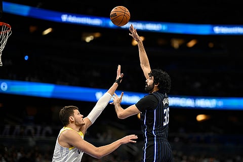 Orlando Magic center Goga Bitadze (35) shoots in front of Utah Jazz center Walker Kessler, left, during the first half of an NBA basketball game in Orlando, Florida.
