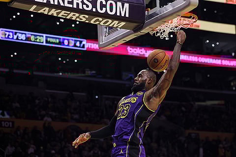 Los Angeles Lakers forward LeBron James dunks during the second half of an Emirates NBA Cup basketball game against the Utah Jazz in Los Angeles.