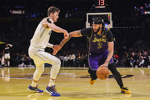 Los Angeles Lakers forward Anthony Davis (3) dribbles past Utah Jazz center Kyle Filipowski during the second half of an Emirates NBA Cup basketball game in Los Angeles.