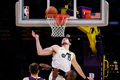 Utah Jazz forward-center Drew Eubanks scores during the second half of an Emirates NBA Cup basketball game against the Los Angeles Lakers in Los Angeles.