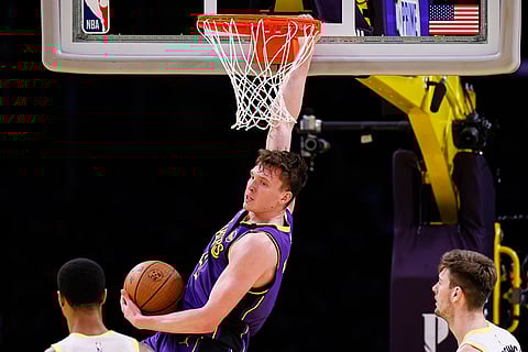 Los Angeles Lakers guard Dalton Knecht dunks during the first half of an Emirates NBA Cup basketball game agaianst the Utah Jazz in Los Angeles.