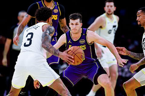 Los Angeles Lakers guard Dalton Knecht celebrates after scoring a 3-pointer during the second half of an Emirates NBA Cup basketball game against the Utah Jazz in Los Angeles.