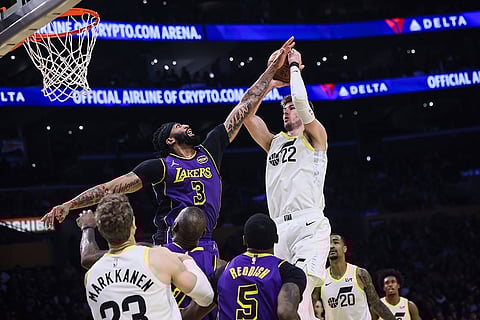 Utah Jazz center Kyle Filipowski, right, scores against Los Angeles Lakers forward Anthony Davis during the first half of an Emirates NBA Cup basketball game in Los Angeles.