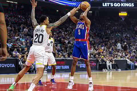 Sacramento Kings guard De'Aaron Fox (5) makes a jump shot over Utah Jazz forward John Collins (20) during the first half of an NBA basketball game in Sacramento, Calif.