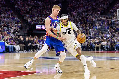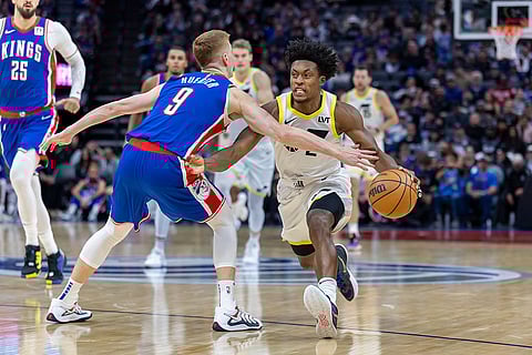 Utah Jazz forward Kyle Filipowski (22) draws the foul on Sacramento Kings forward Keegan Murray (13) during the second half of an NBA basketball game in Sacramento, Calif.
