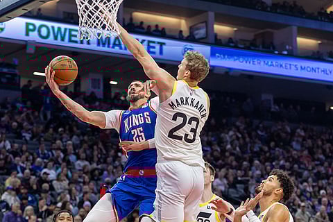 Sacramento Kings center Alex Len (25) makes a layup around Utah Jazz forward Lauri Markkanen (23) during the first half of an NBA basketball game in Sacramento, Calif.