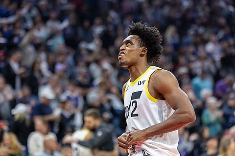 Utah Jazz guard Collin Sexton looks at the basket before an NBA basketball game against the Sacramento Kings in Sacramento, Calif.