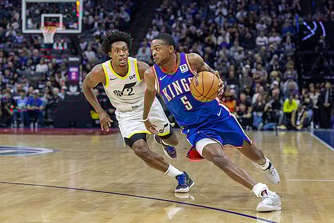 Sacramento Kings guard De'Aaron Fox (5) drives to the basket past Utah Jazz guard Collin Sexton (2) during the first half of an NBA basketball game in Sacramento, Calif.