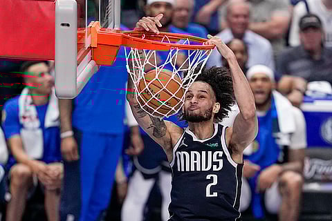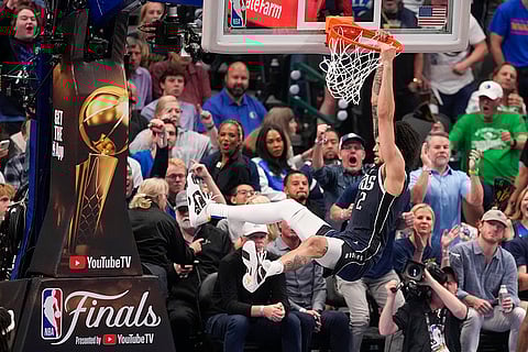 Dallas Mavericks center Dereck Lively II hangs from the rim after a basket against the Boston Celtics during the first half in Game 3 of the NBA basketball finals in Dallas.