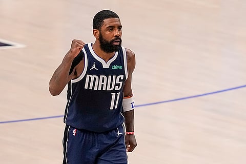 Dallas Mavericks guard Kyrie Irving reacts during the second half in Game 3 of the NBA basketball finals against the Boston Celtics in Dallas.