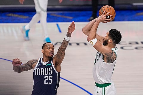 Boston Celtics forward Jayson Tatum, right, shoots against Dallas Mavericks forward P.J. Washington during the second half in Game 3 of the NBA basketball finals in Dallas.
