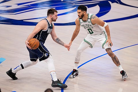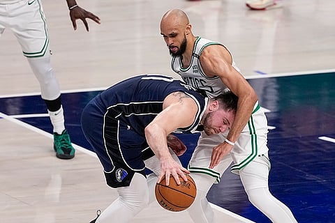 Dallas Mavericks guard Luka Doncic, left, drives against Boston Celtics guard Derrick White during the second half in Game 3 of the NBA basketball finals in Dallas.